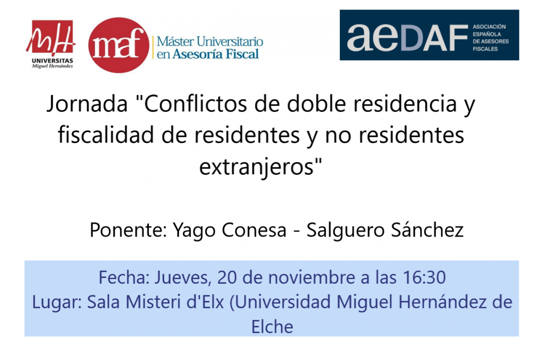 El próximo jueves 20 de noviembre se celebrará en la Universidad Miguel Hernández de Elche la jornada «Conflictos de residencia y fiscalidad de residentes y no residentes extranjeros», organizada por la Delegación Territorial de Alicante-Albacete de la AEDAF | Asociación Española de Asesores Fiscales.