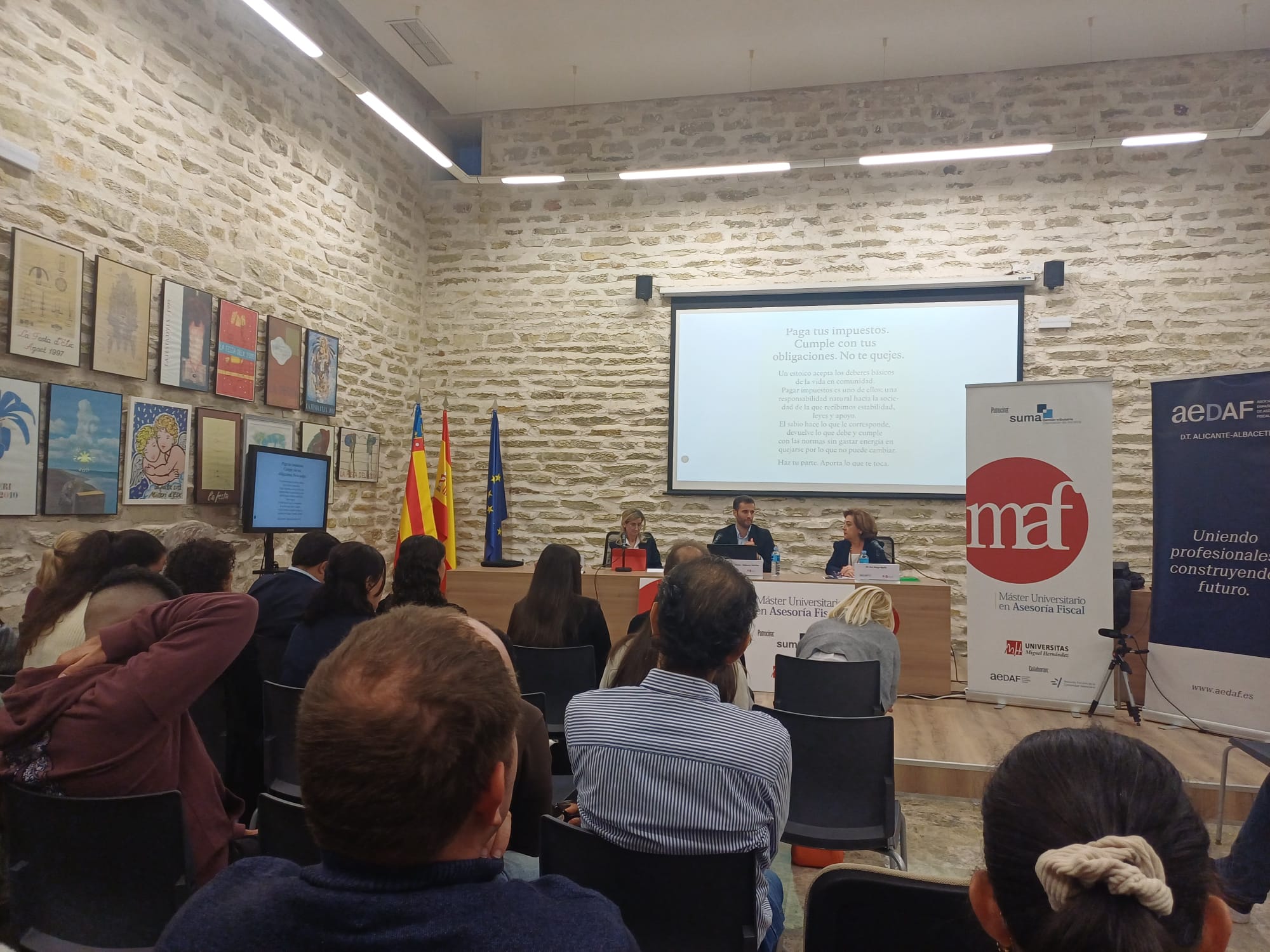 Os dejamos unas fotografías de la misma. Fue una jornada muy interesante, sobre un tema de gran actualidad. El ponente fue Yago Conesa-Salguero Sánchez, asesor fiscal especialista en la materia y Alumni del Máster Universitario en Asesoría Fiscal. Durante el acto estuvo acompañado por Eva Aliaga Agulló, directora del Máster Universitario en Asesoría Fiscal, y por M José Sueiro Adrián, delegada territorial de Alicante y Albacete de la citada Asociación.