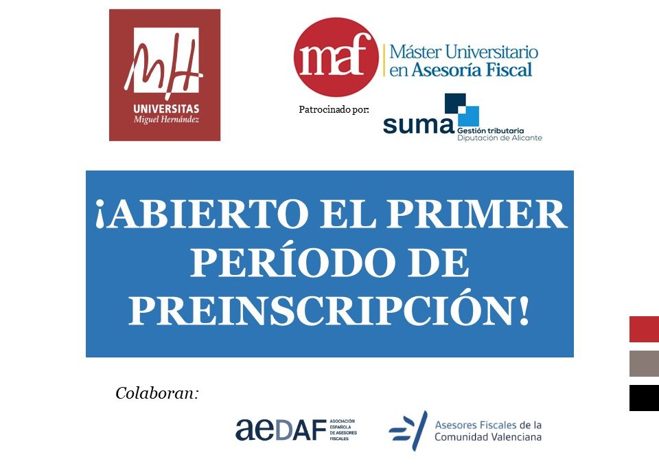 ¡El pasado 16 de marzo se abrió el primer plazo para realizar la preinscripción en el Máster Universitario en Asesoría Fiscal de la Universidad Miguel Hernández de Elche para el curso 2026-2027!